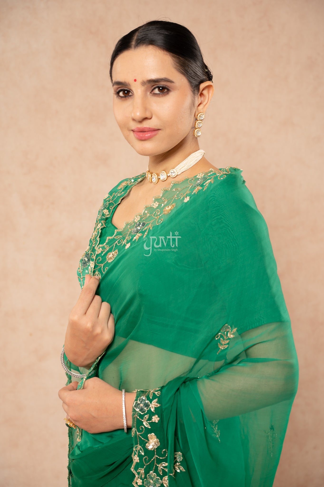 Green Shaded Viscose Chiffon Aari Sequins Kardana Border Jaal Handwork Party wear Saree with Blouse